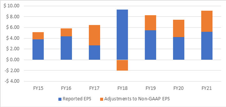 What is worse, non-GAAP earnings are what the market follows and what analysts attempt to forecast. The diagram below shows Stryker Corp’s reported earnings and the adjustments management make to get to non-GAAP figures. In certain years, adjustments almost equal half of the group’s annual reported earnings!