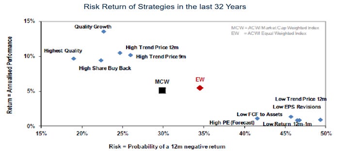 The data provided by GMO is supported by a more granular study done by Bank of America Global Research (shown above). Here quality is split into different sub-categories, but the base conclusion is still that high quality businesses provide compelling risk/reward.