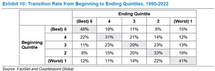 “These results naturally prompt the question of the rate of transition from one ROIC quintile to another over time. Exhibit 10 shows those results for 3-year periods from 1990 to 2022. The most common outcome for a company within a starting quintile is to end up in the same quintile.”