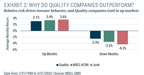 Another factor has to do with relative performance. Quality as a factor generally underperforms in bull markets. Markets have been in bull territory for ~72% of the time throughout history, so logically, if a manager wants to outperform, quality won’t allow them to stand out. The flipside to this argument is that quality more than claws back the performance differential in bear markets. Remember the Law of Losses: a percentage loss hurts your portfolio more than an equal percentage gain helps it. That's because a percentage loss can only be erased by a larger percentage gain, regardless of whether the loss or gain occurs first.
